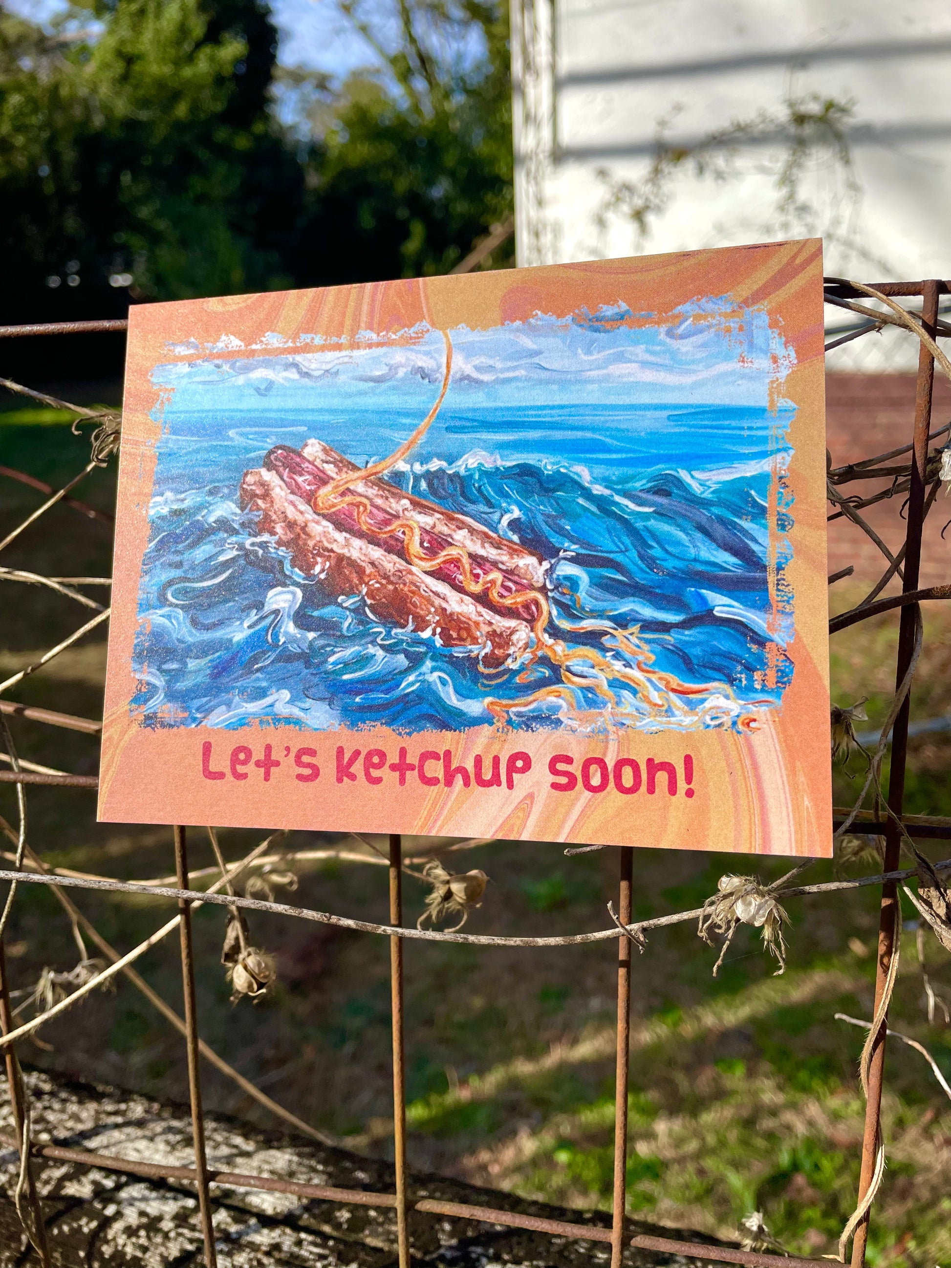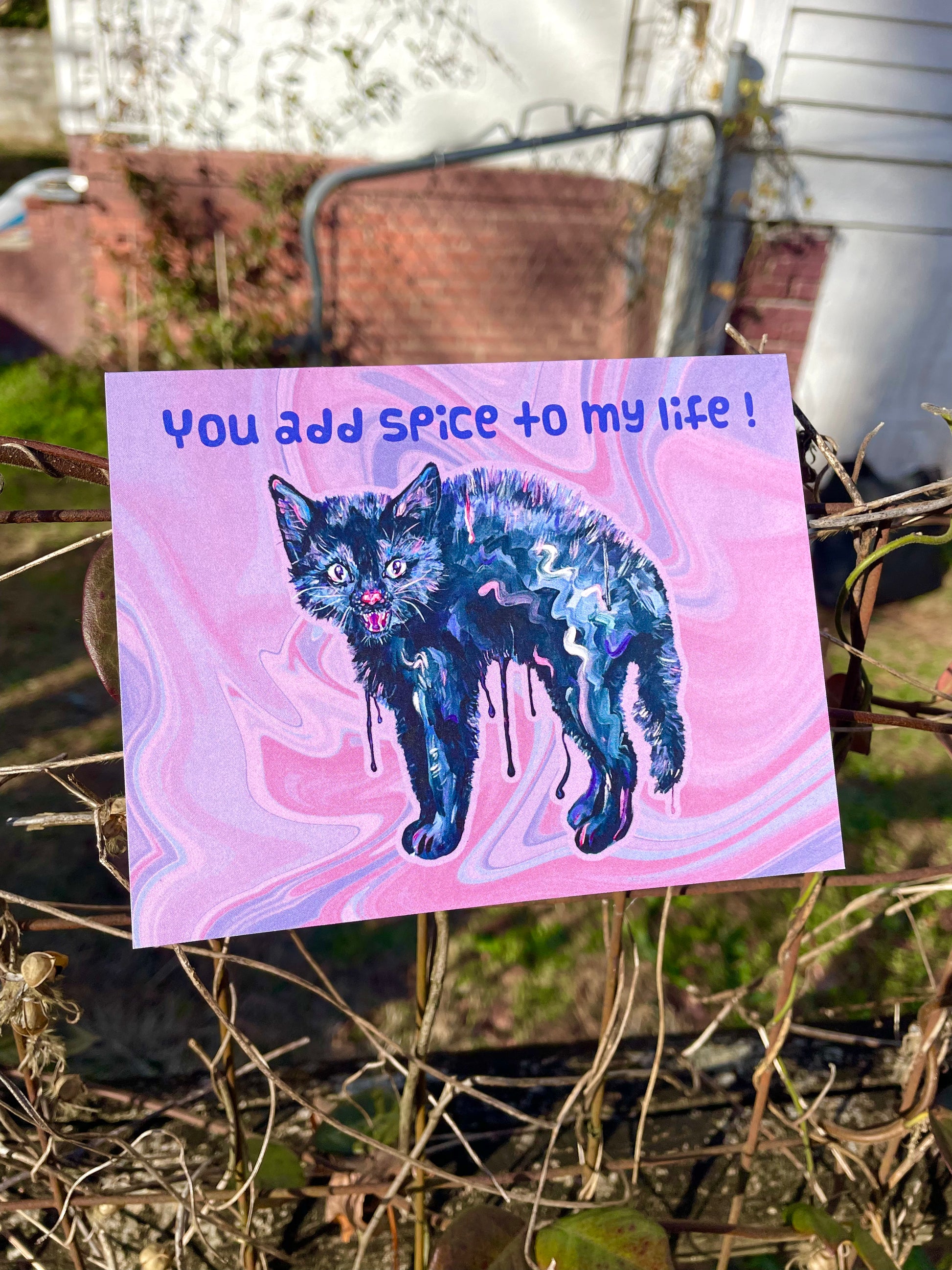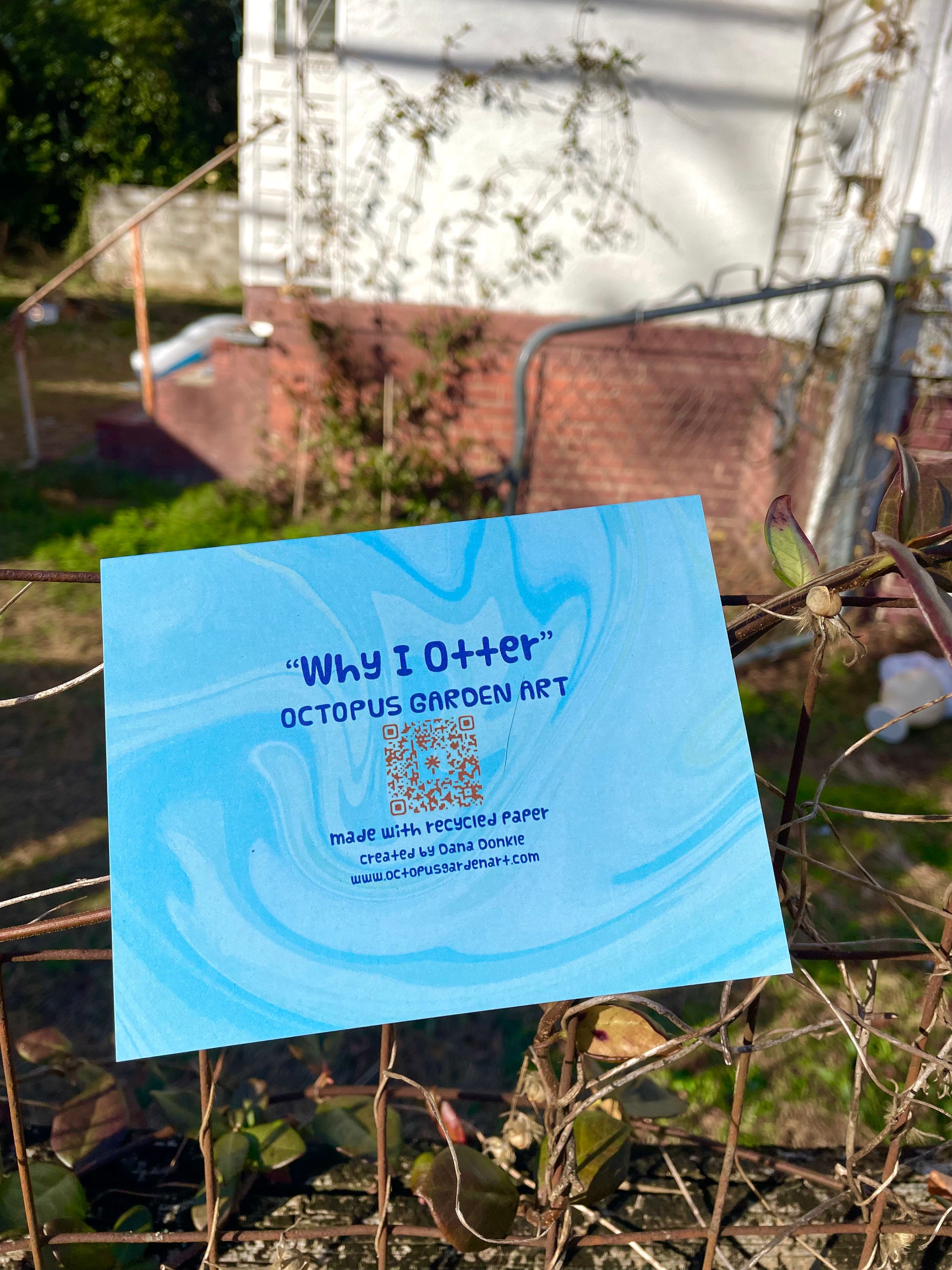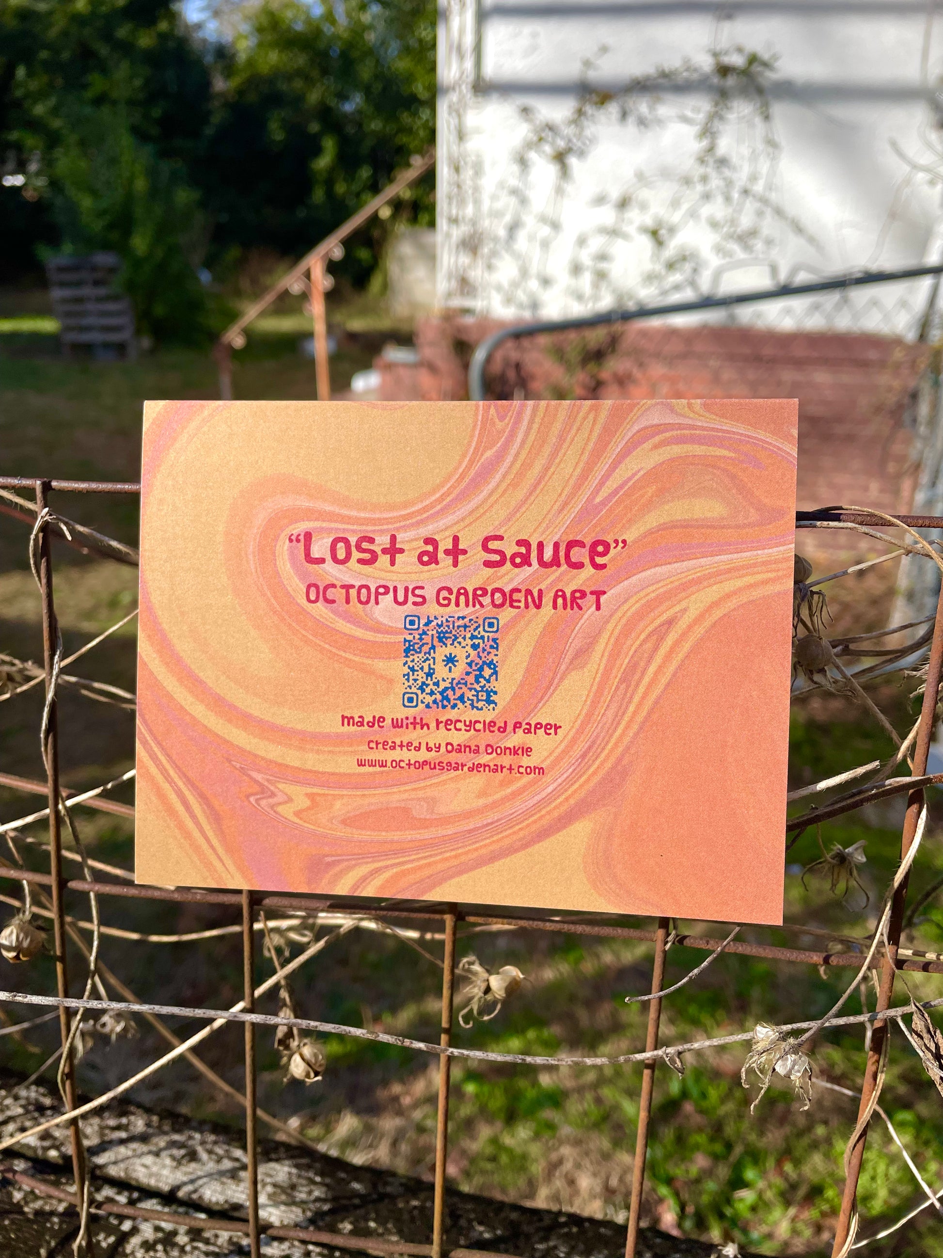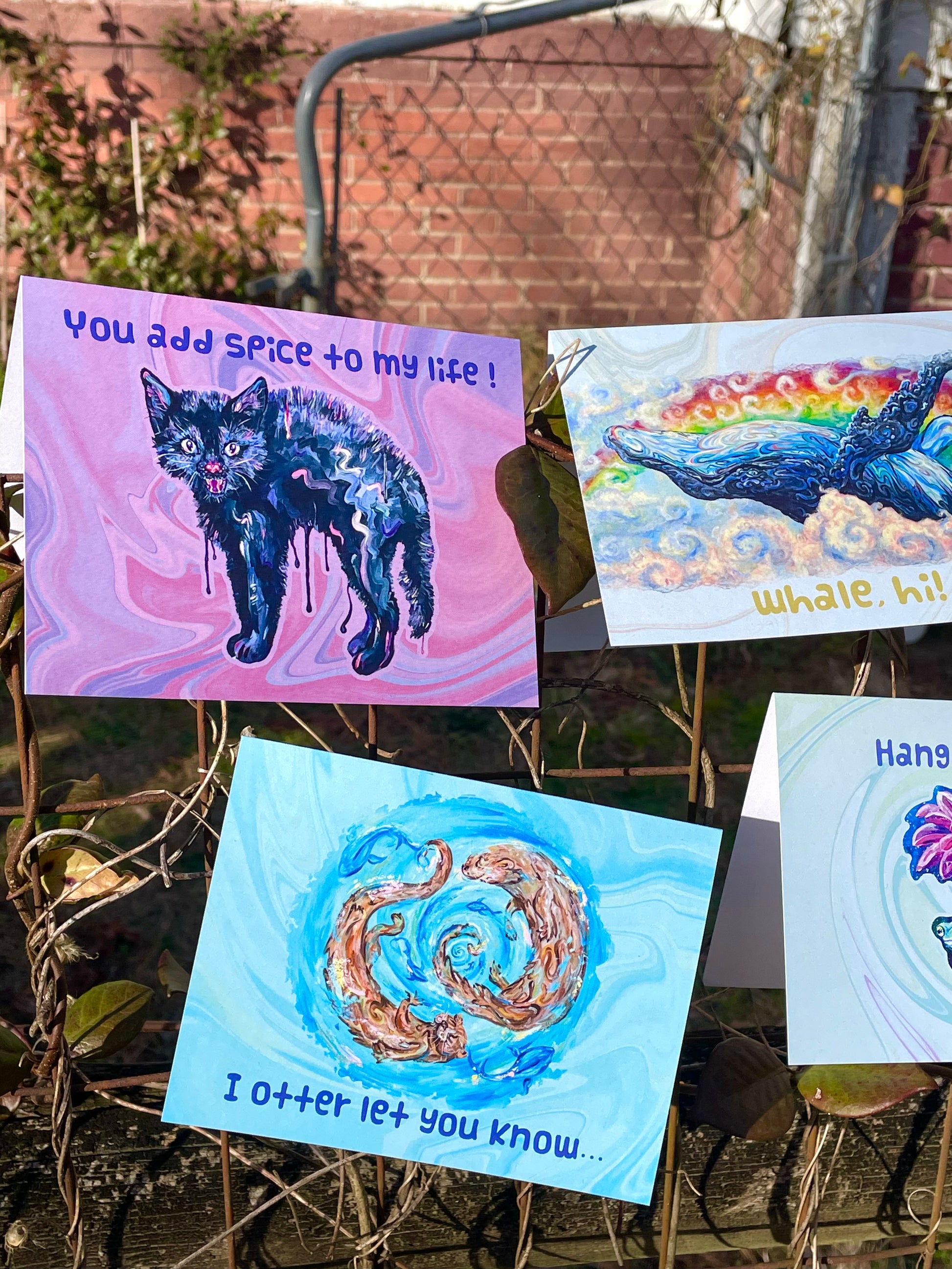 Blank on the inside. Printed on recycled paper. 4.5" X 5.5". Comes with kraft A2 envelopes.